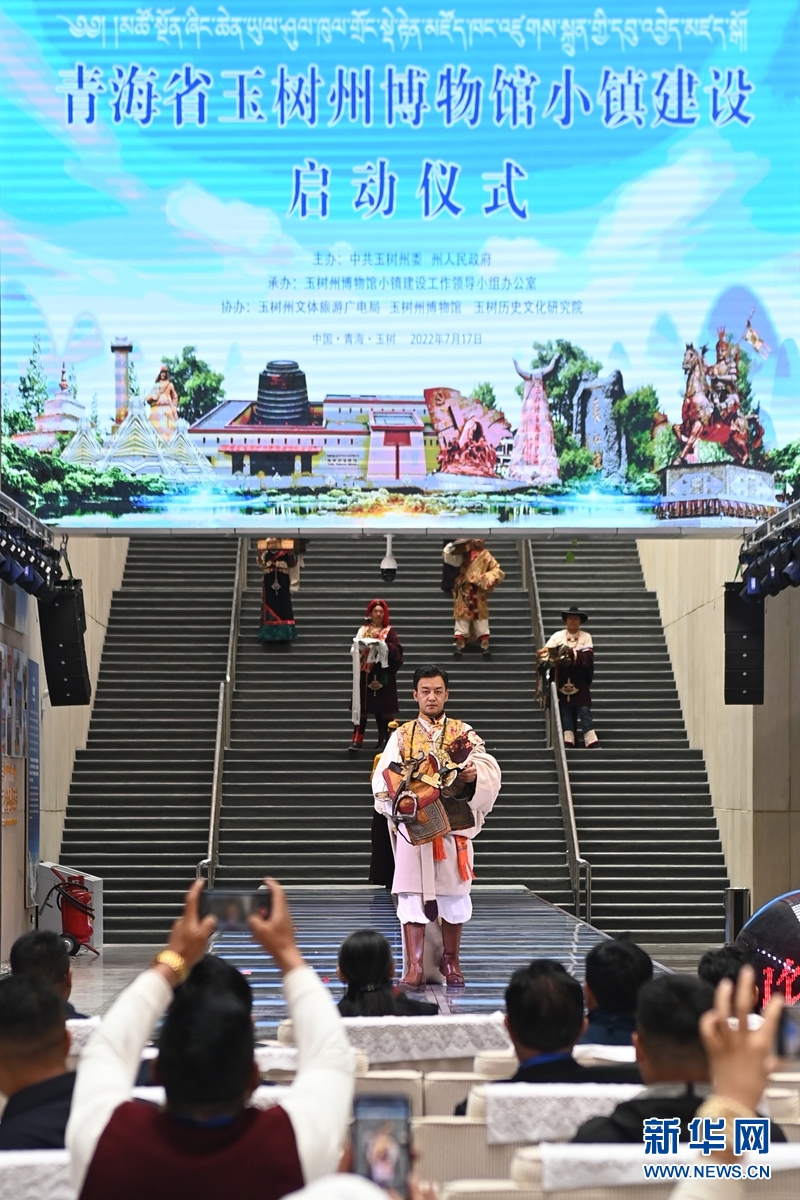 這是17日拍攝的青海省玉樹州博物館小鎮(zhèn)建設啟動儀式現(xiàn)場,模特正在展示博物館藏品。新華社記者 范培珅攝