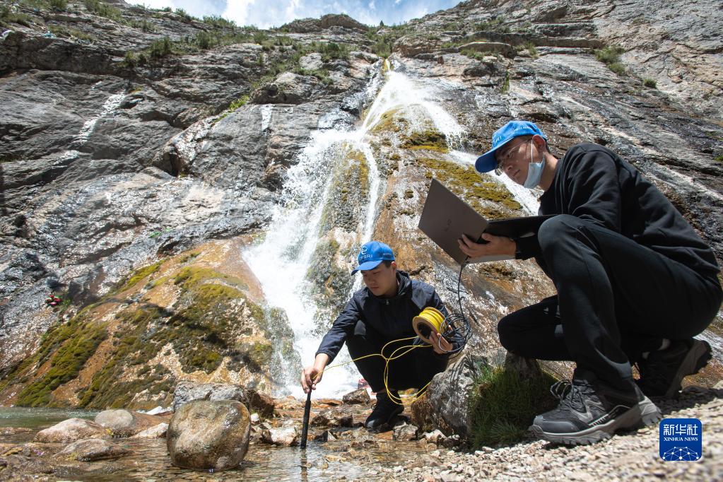 7月24日,長江科學(xué)院科考隊(duì)員李魯?shù)ぃㄓ遥┡c劉晗在瀾滄江源區(qū)的扎曲進(jìn)行科考工作?!⌒氯A社記者 肖藝九 攝