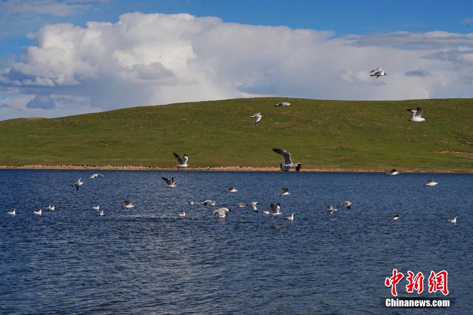 圖為水鳥在鄂陵湖自由飛翔。馬銘言 攝