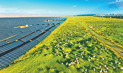 青海省海南藏族自治州,綿延數(shù)百平方公里的塔拉灘生態(tài)光伏發(fā)電園區(qū)里,深藍(lán)色的“光伏海洋”蔚為壯觀,光伏板下牧草茂盛,綠意盎然。