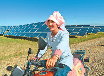 落日余暉中,牧民索南卓瑪騎著一輛摩托車,沿著歸家的方向,緩緩跟在羊群后面?!白詮难b了光伏板,生態(tài)治理同步發(fā)力,一些戈壁灘變成了綠地,我們的生活也越來越好了?!睂?duì)眼前土地發(fā)生的變化,生于斯長(zhǎng)于斯的索南卓瑪深有感觸。