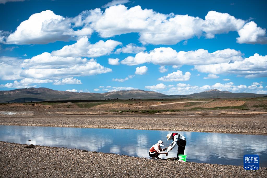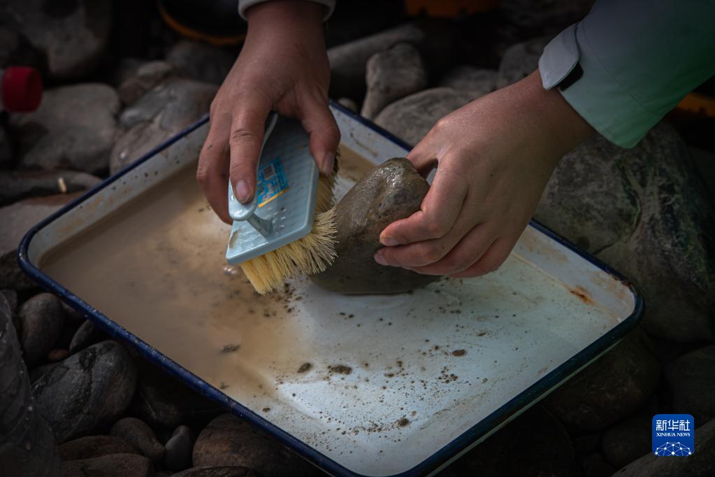 7月24日,長江科學(xué)院科考隊(duì)員在采集底棲動物樣本。 新華社記者 肖藝九 攝