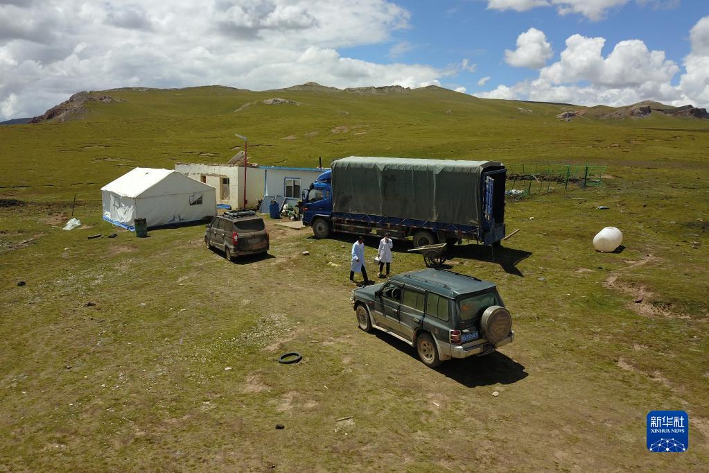 在治多縣索加鄉(xiāng)當(dāng)曲村,布久索南更青(左)和同事一起前往牧民家中問診(8月11日攝,無人機照片)。新華社記者 范培珅 攝