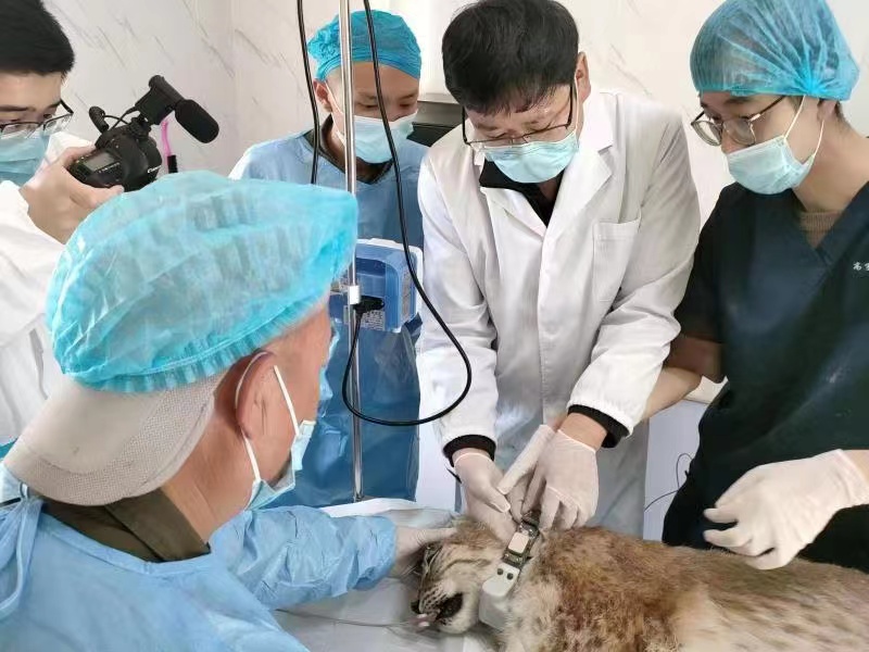 青海野生動物救護(hù)繁育中心工作人員正在救助猞猁。(圖片由青海省林業(yè)和草原局提供)
