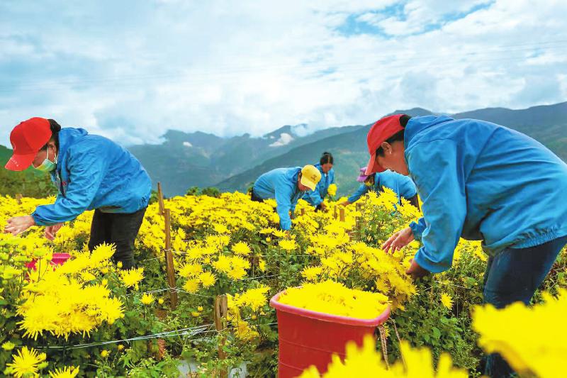 進(jìn)入8月,在四川省涼山州木里藏族自治縣喬瓦鎮(zhèn)簸箕籮村木里縣農(nóng)業(yè)產(chǎn)業(yè)示范園里,150畝的金絲皇菊像一塊巨大的金色地毯鋪在田野上?!艾F(xiàn)在正是金絲皇菊的采收時(shí)節(jié),村民們的腰包又要鼓起來(lái)了!”木里縣委書(shū)記高峰說(shuō)。