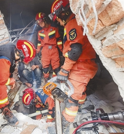 9月5日17時(shí)16分,海螺溝景區(qū)消防救援大隊(duì)對(duì)位于磨西鎮(zhèn)老街一酒店二樓的被困群眾展開營(yíng)救。消防救援人員破拆加固建筑廢墟、安全評(píng)估現(xiàn)場(chǎng)環(huán)境,并對(duì)廢墟中的障礙物進(jìn)行清理,經(jīng)過(guò)緊張救援,被困群眾被成功救出。王明峰 劉國(guó)謙 攝影報(bào)道