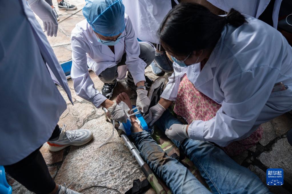 9月6日,在四川甘孜州瀘定縣磨西鎮(zhèn)海螺溝廣場受災(zāi)群眾臨時(shí)安置點(diǎn),醫(yī)護(hù)人員為傷員包扎。新華社記者 才揚(yáng) 攝