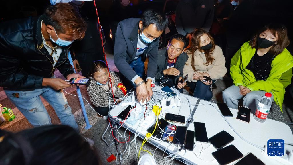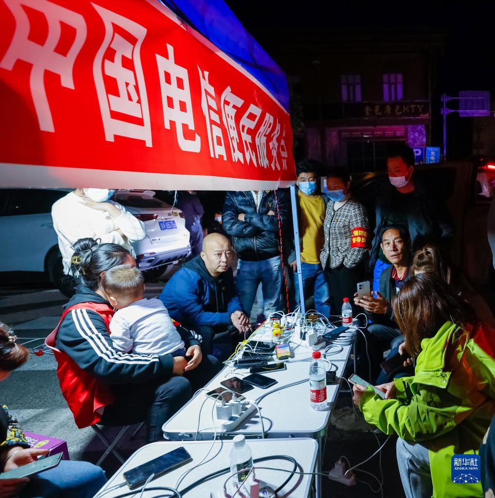 9月5日晚,在四川甘孜州瀘定縣磨西鎮(zhèn)的受災(zāi)群眾臨時(shí)安置點(diǎn),人們?cè)谥袊娦疟忝穹?wù)點(diǎn)為手機(jī)充電。新華社 沈伯韓 攝
