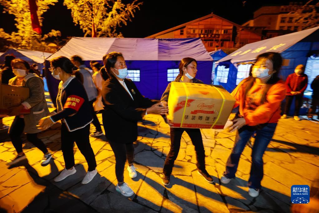 9月5日晚,在四川甘孜州瀘定縣磨西鎮(zhèn)的受災(zāi)群眾臨時(shí)安置點(diǎn),人們?cè)趥鬟f救災(zāi)物資。新華社 沈伯韓 攝