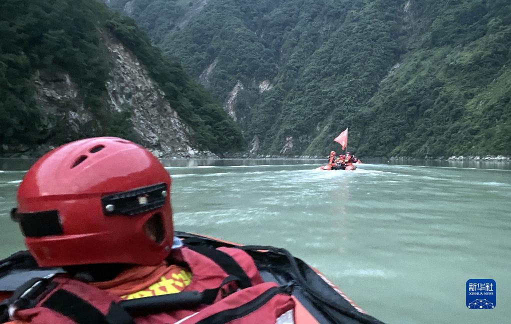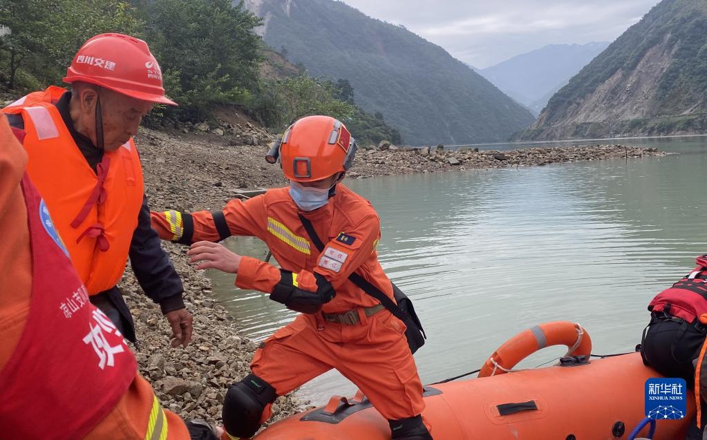 9月6日,四川森林消防總隊甘孜支隊消防員乘橡皮艇進入瀘定縣得妥鎮(zhèn)紫雅場村。新華社 魏紅 攝