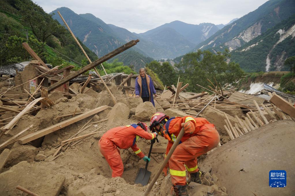9月7日,四川眉山消防救援隊(duì)隊(duì)員在雅安市石棉縣王崗坪彝族藏族鄉(xiāng)幸福村二組,幫助村民在倒塌的房屋中找尋物品。新華社記者 才揚(yáng) 攝