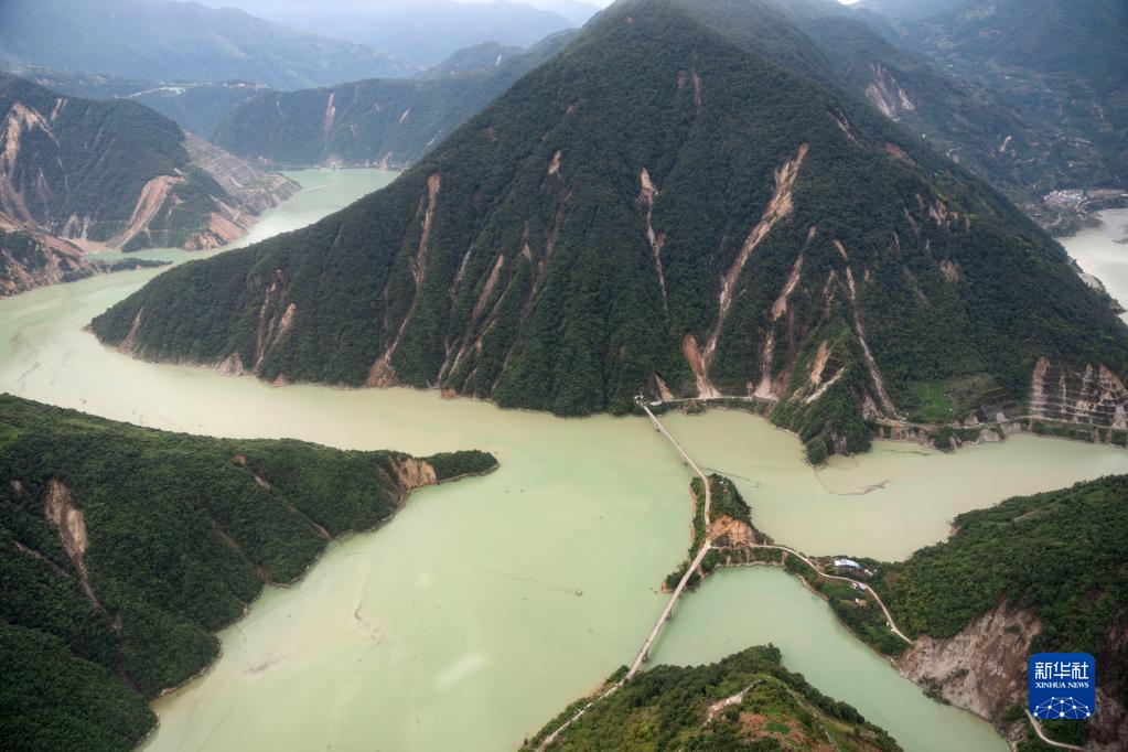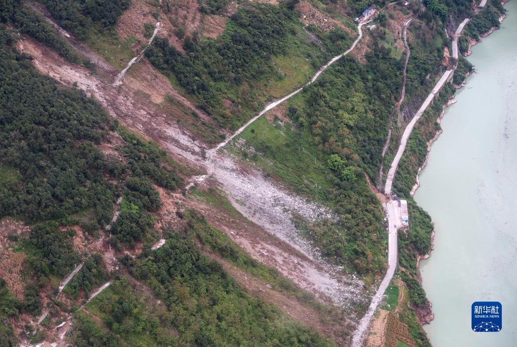 這是9月7日拍攝的雅安市石棉縣王崗坪彝族藏族鄉(xiāng)幸福村二組附近的照片,能看到山體多處滑坡(無人機(jī)照片)。新華社記者 才揚(yáng) 攝