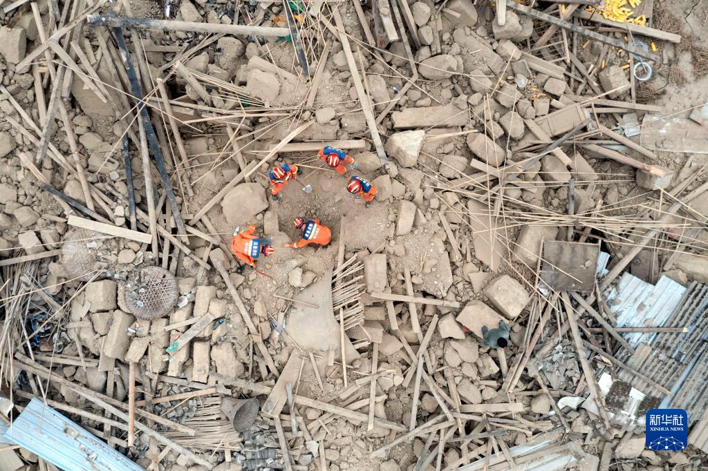 9月7日,在雅安市石棉縣王崗坪彝族藏族鄉(xiāng)幸福村二組,四川眉山消防救援隊(duì)隊(duì)員幫助村民在倒塌的房屋中找尋物品(無人機(jī)照片)。新華社記者 才揚(yáng) 攝
