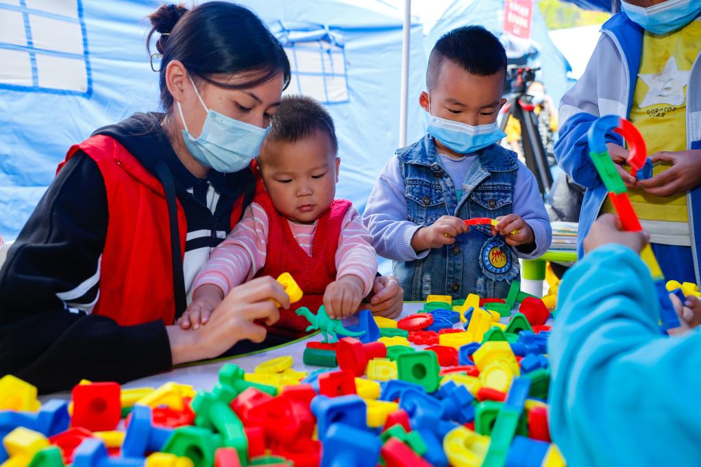 在磨西鎮(zhèn)磨西廣場(chǎng)集中安置點(diǎn)的帳篷內(nèi),一群孩子正在“紅馬甲”哥哥姐姐們的指導(dǎo)下畫(huà)畫(huà)。帳篷外,用簡(jiǎn)易紙板做成的牌子“青青樂(lè)園”特別顯眼,這是甘孜地震災(zāi)區(qū)首個(gè)建在地震震中的兒童樂(lè)園。