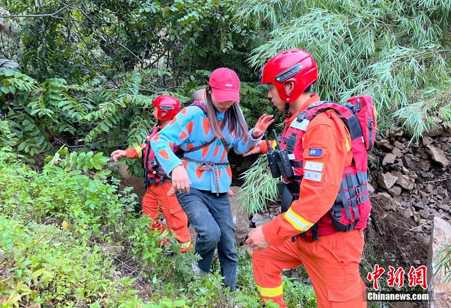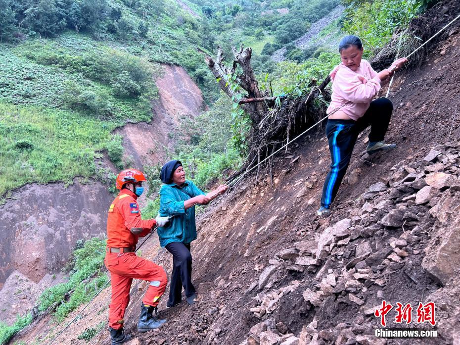 救援人員護送村民通過垮塌路段,安全下山。譚昊 攝