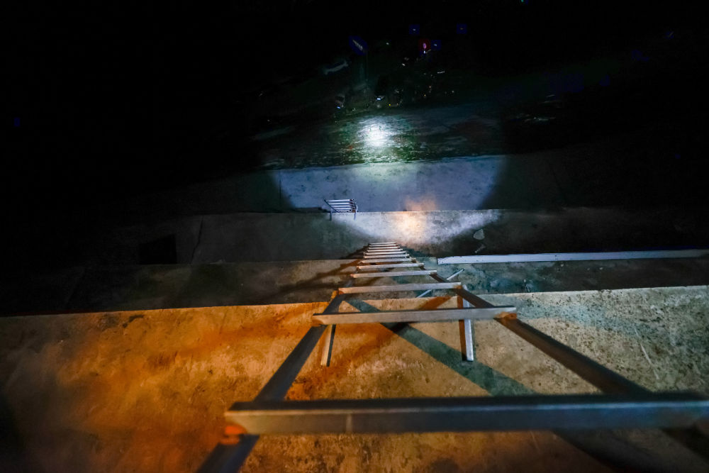 本以為沿著這條公路就可以走到得妥,轉(zhuǎn)過(guò)幾道彎,前面道路中斷完全無(wú)法通行,李祥帶我們到了真正可以下山的地方。這是一片分為好幾層的幾乎垂直的水泥邊坡,即便是應(yīng)急電筒的強(qiáng)光,也照不亮它的底。每層邊坡之間有鋼梯連接,我們要順著鋼梯爬下去,“山下會(huì)有車(chē)來(lái)接我們”,李祥淡定地說(shuō)。