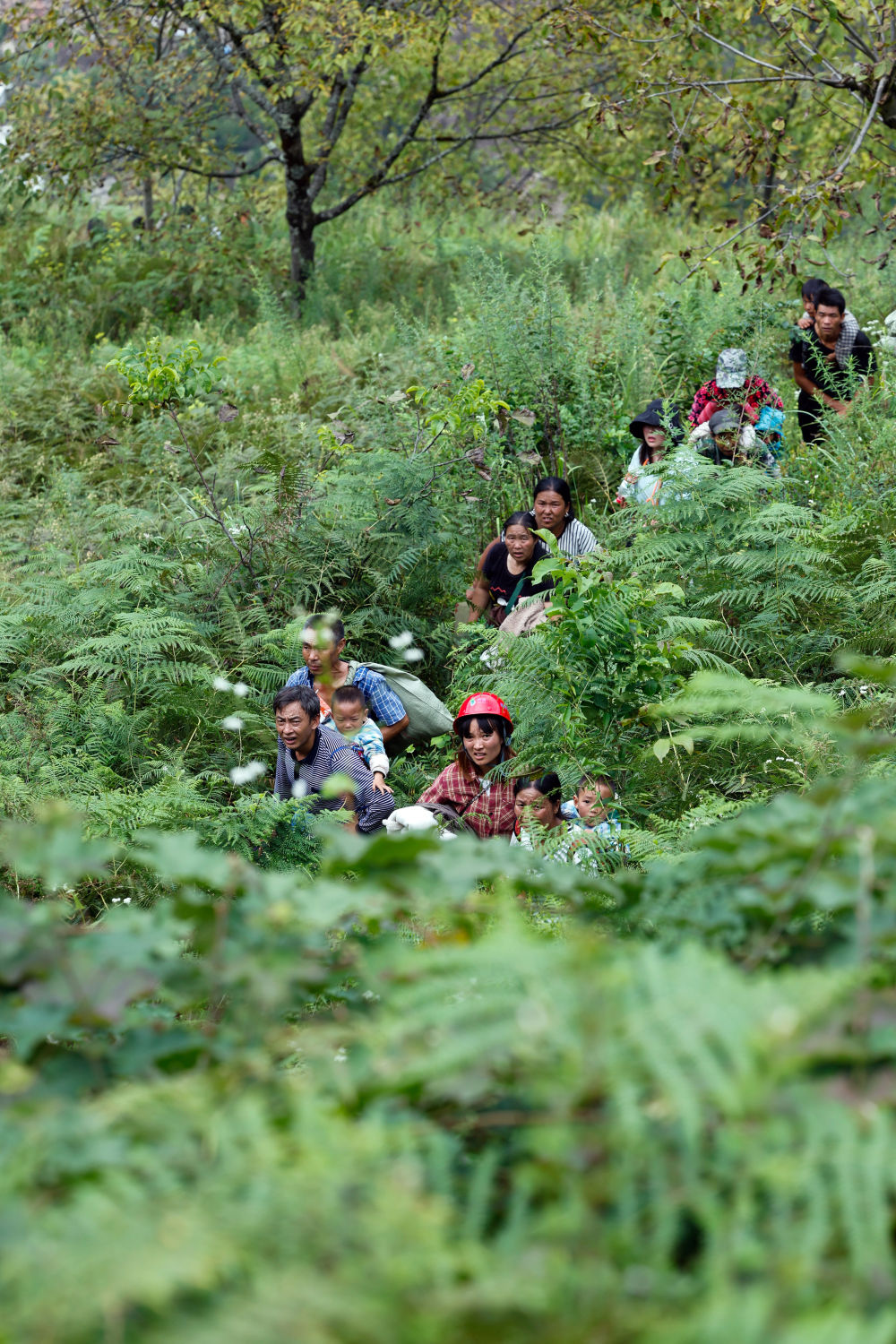 熟悉地形的村民在前帶路。其實(shí)毫無(wú)“路”可言,我和救援人員只能沿著依稀可辨的足跡向上攀爬。山高陡峻,時(shí)不時(shí)會(huì)遇到山體傾斜角度大于60度的路段,只能手腳并用才能上去。為了減輕負(fù)重,我把巧克力這樣的補(bǔ)給都放在了山下,只帶了一瓶水在身上。很快,滿(mǎn)頭大汗,汗水流入眼睛刺得生疼。抬頭望著遙遠(yuǎn)的需要翻越的山頭,對(duì)體力和耐性都是巨大考驗(yàn)。一些救援人員因?yàn)楣ぷ餍枰€背著很重的繩子,辛苦程度可見(jiàn)一斑。