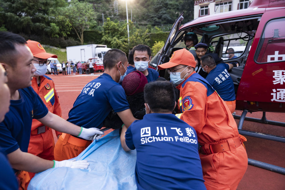 9月6日,救援人員抬著一名從灣東村疏散出來(lái)的受傷村民,準(zhǔn)備通過(guò)直升機(jī)將其運(yùn)出。