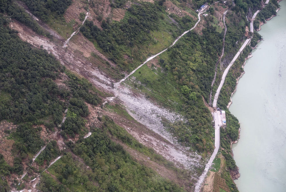 這是9月7日拍攝的幸福村二組附近的照片,可看到山體多處滑坡(無(wú)人機(jī)照片)。