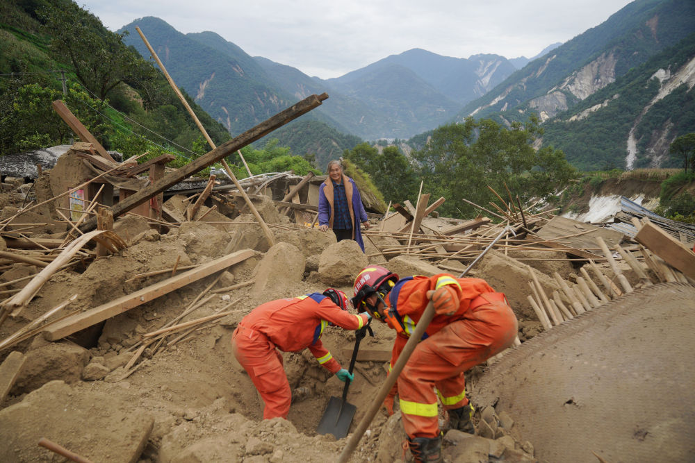 經(jīng)過(guò)3個(gè)多小時(shí)的攀爬,終于抵達(dá)紅花崗。村民們的房子倒塌嚴(yán)重,有的房頂直接砸在了地上。稍事休息,我和救援人員沿著公路向山下的灣東村繼續(xù)行進(jìn)。這條公路被塌方損毀較為嚴(yán)重,石頭、泥土、被帶下來(lái)的粗壯樹(shù)木橫亙?cè)诘缆分醒?,有時(shí),甚至整個(gè)路段都被掩埋、下沉。