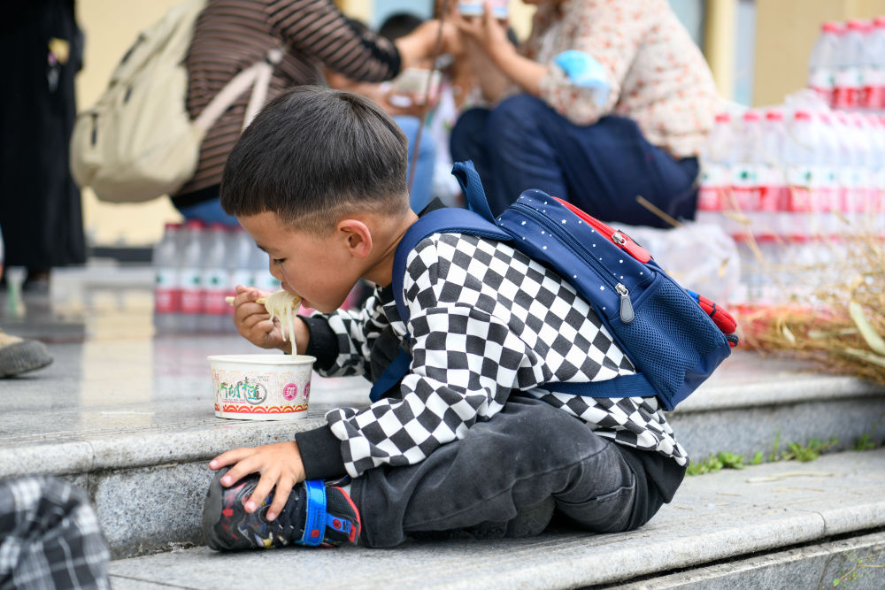 采訪(fǎng)當(dāng)天,這個(gè)安置點(diǎn)里的伙食團(tuán)依舊承包了在場(chǎng)所有村民、救援人員以及采訪(fǎng)隊(duì)伍的午飯,大家依次排隊(duì)領(lǐng)取,補(bǔ)充體力。一旁的草科鄉(xiāng)中心小學(xué)內(nèi),118名孩子也享用著熱氣騰騰的午飯。