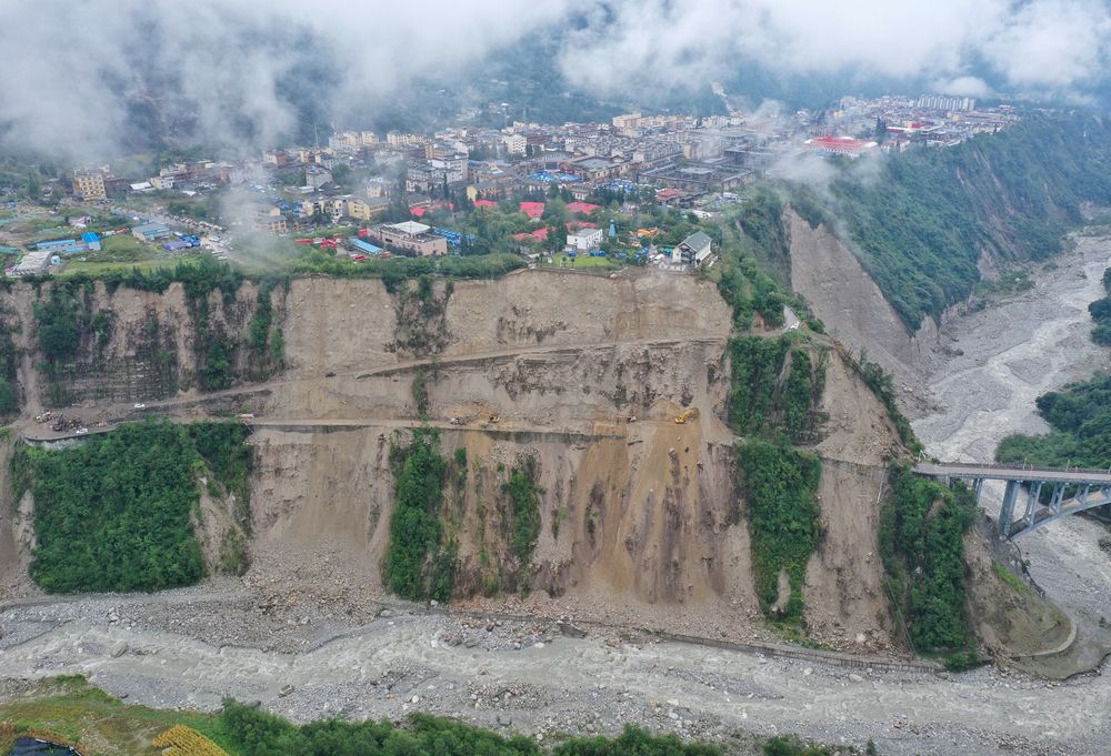 9月9日,搶險(xiǎn)人員在搶通磨西鎮(zhèn)附近道路(無(wú)人機(jī)照片)。