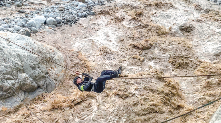 焦慮之際,另一組隊(duì)員沿河搜尋發(fā)現(xiàn)一塊離河對(duì)岸較近的巨石,率先過河的戰(zhàn)友打錨點(diǎn)接應(yīng),很快在兩邊架起一座“飛索橋”,曾經(jīng)當(dāng)過高山向?qū)У耐跞f銳第一個(gè)沖上去,四肢倒掛,背對(duì)激流,飛快移向?qū)Π?。緊接著,隊(duì)員沙馬澤呷躍上飛索。鋼索和飛索兩路同時(shí)過河,隊(duì)伍很快全部來到對(duì)岸。