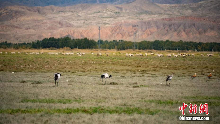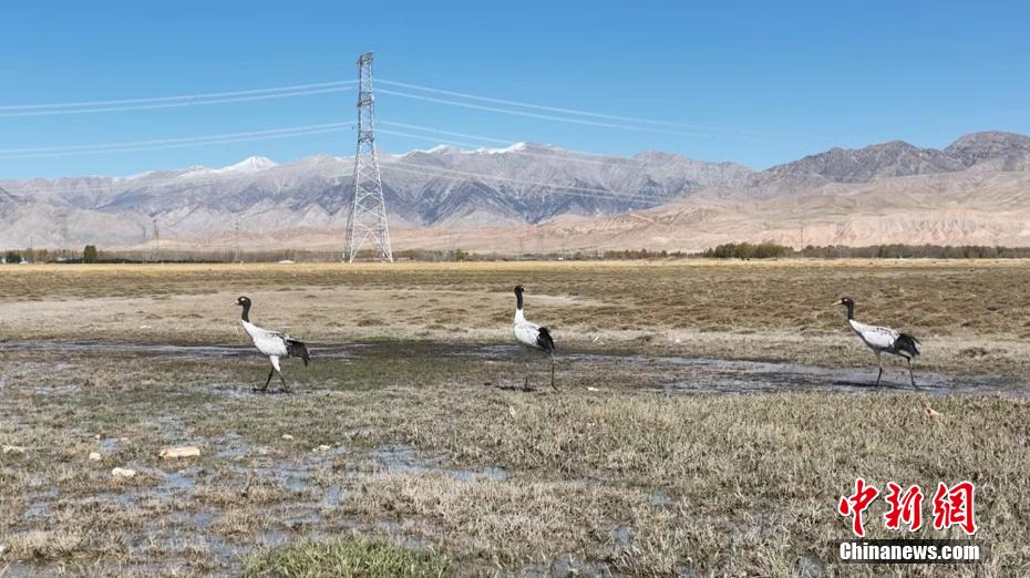 近日,在柴達(dá)木盆地青海烏蘭縣東大灘濕地附近,棲息著六七只黑頸鶴,它們或擠在一起沐浴秋日的暖陽(yáng),或三五成群覓食嬉戲,或踏著黑色細(xì)長(zhǎng)的腿閑庭信步,優(yōu)雅、從容,悠然自在地散步,或振翅飛翔,為金秋時(shí)節(jié)的東大灘濕地增添了一份美麗與靈動(dòng)。烏蘭縣融媒體中心 供圖