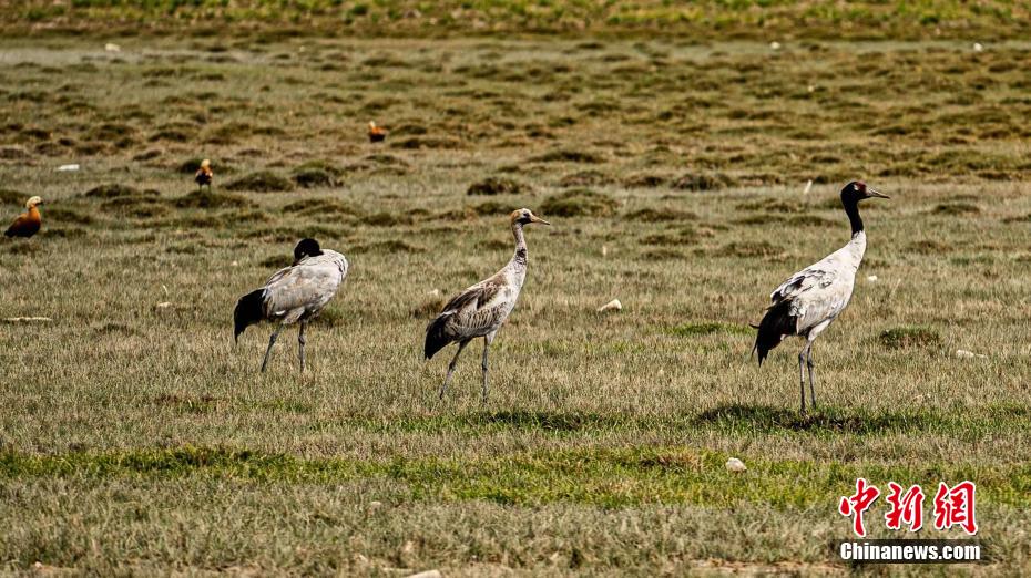 圖為黑頸鶴群在覓食。 烏蘭縣融媒體中心 供圖