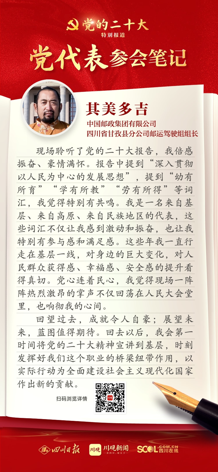 出席盛會(huì),來(lái)自四川的黨代表深感使命光榮、責(zé)任重大,大家認(rèn)真履職,結(jié)合報(bào)告談?wù)J識(shí)、談體會(huì)、談打算。川觀新聞特此推出“黨代表參會(huì)筆記”欄目,分享黨代表們的參會(huì)心得,敬請(qǐng)垂注。