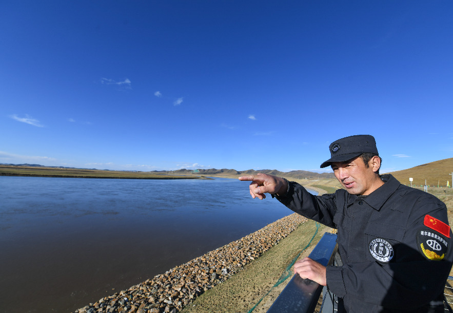 在四川省阿壩州若爾蓋縣,護(hù)河隊(duì)隊(duì)員在黃河邊觀察情況。新華社記者 王曦 攝