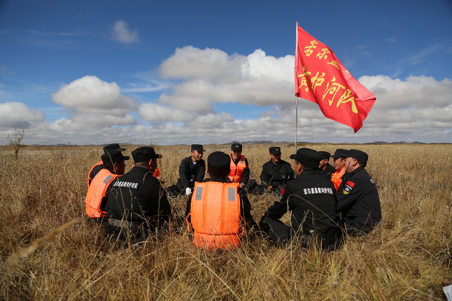 在四川省阿壩州若爾蓋縣,部分黃河護(hù)河隊(duì)隊(duì)員列隊(duì)準(zhǔn)備出發(fā)巡河。新華社記者 王曦 攝