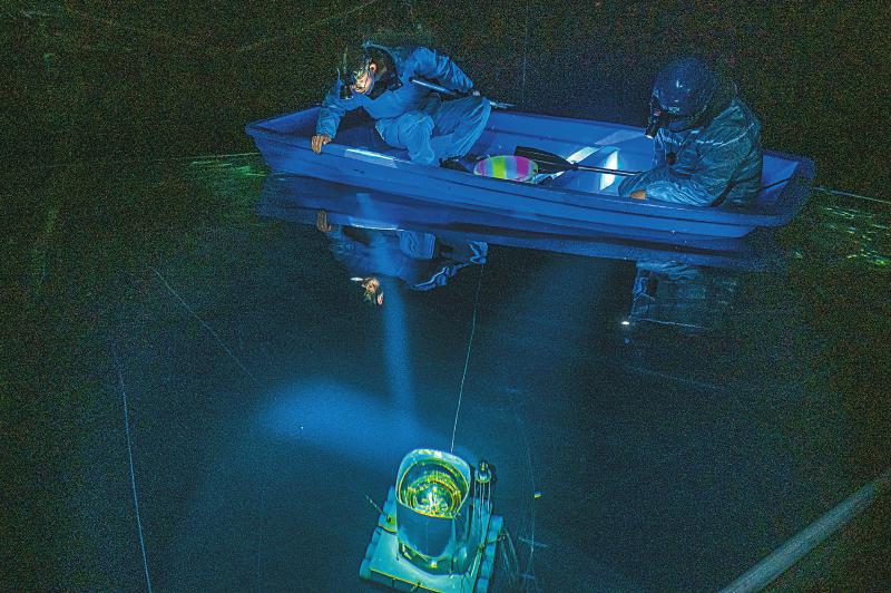 10月21日,陳明君(左)與團隊工作人員觀察水下4.5米深的探測器單元的光電倍增管。