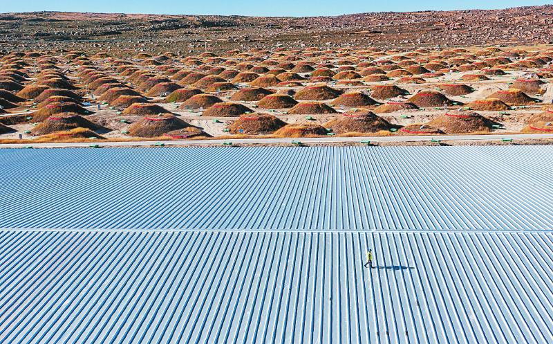 10月21日,科研人員行走在水切倫科夫探測器的屋頂上。遠方的每個大概36平方米的土堆是拉索的繆子探測器,放置了裝有超純水的高反射率水袋。