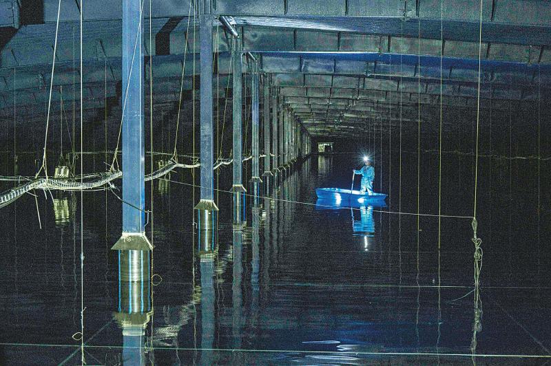 24日,陳明君和同事穿上潔凈服、戴上腳套,劃著小船進入伸手不見五指的三號水池,他們要逐一檢查維護這里的探測器單元和電子學(xué)箱。船劃到指定位置,黑暗中陳明君的頭燈光束直射水底,水下碩大的探測器單元核心設(shè)備——光電倍增管,被照得清晰可見,他和同事一起用“鉤子”把光電倍增管拉起,進行檢查?!八乩锏纳疃仁?.5米,這些純凈水的透明度比自來水高三倍以上,切倫科夫光就從里面捕獲。”陳明君告訴記者。