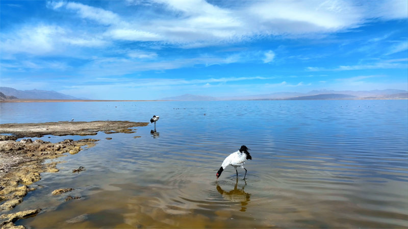 初冬時(shí)節(jié),在青海省海西蒙古族藏族自治州烏蘭縣都蘭湖國家濕地公園內(nèi),四只國家一級(jí)保護(hù)動(dòng)物黑頸鶴,踏著黑色細(xì)長的腿在湖中閑庭信步,與斑頭雁、赤麻鴨一起嬉戲覓食,盡顯柴達(dá)木盆地濕地生態(tài)之美。