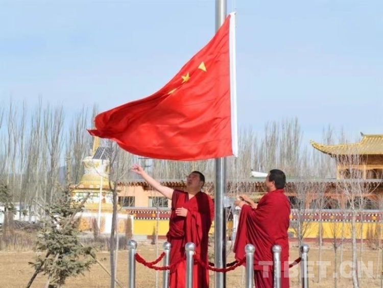 圖為青海省海南藏族自治州僧人在宗教活動(dòng)場所升國旗