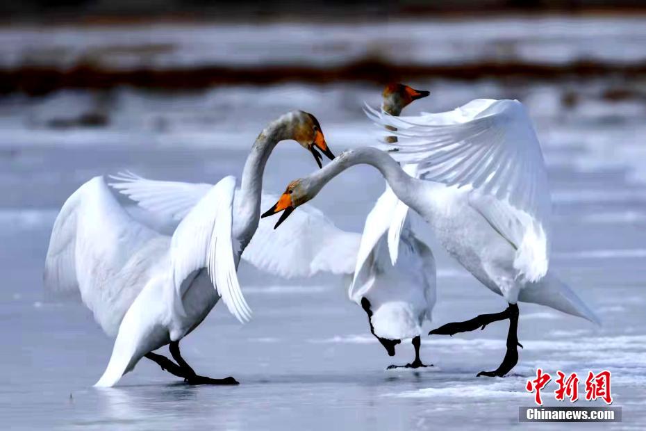 圖為天鵝在湖面嬉戲?!◇泱憔?攝