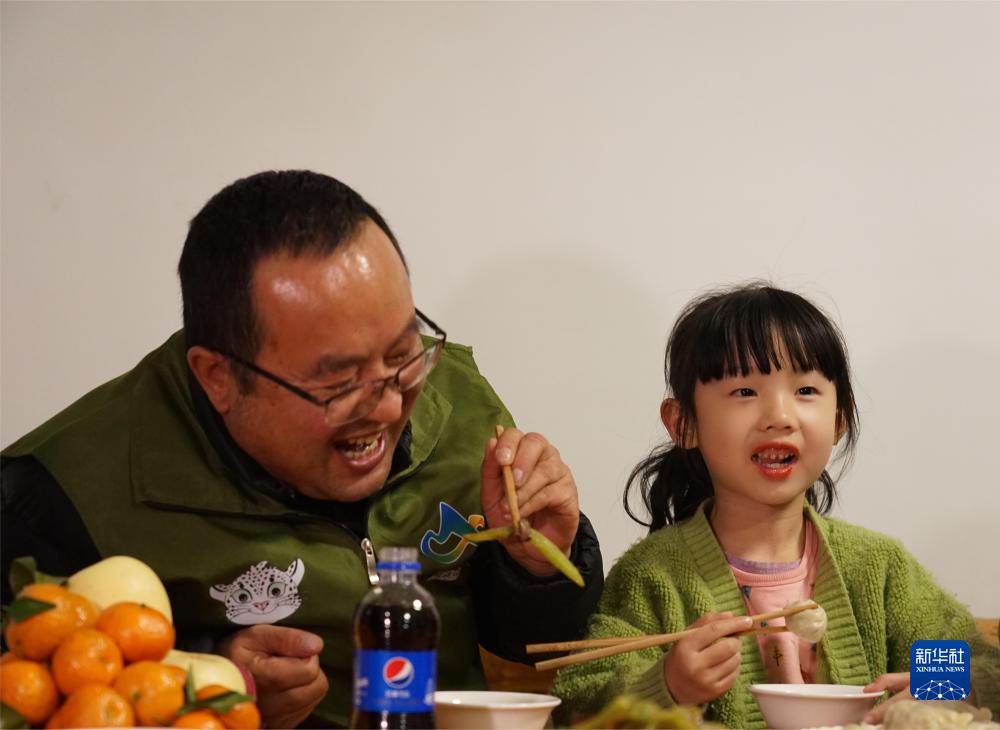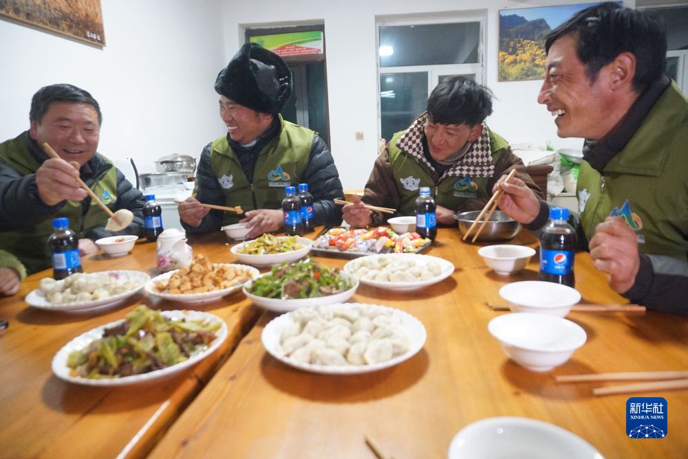 1月14日晚,管護(hù)員們?cè)谝黄鸪燥溩?。新華社記者 周盛盛 攝