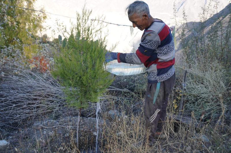 1950年出生在茂頂村木達(dá)水村民小組的丁爭(zhēng),小時(shí)候多次看到雨季村里洪水成災(zāi),泥石流橫行,山體滑坡的場(chǎng)景。那時(shí)經(jīng)濟(jì)落后,村民日子過(guò)得苦。丁爭(zhēng)隨母親去頭人家放牛,由于天氣炎熱,饑渴難耐,母親就摘一個(gè)頭人家蘋(píng)果充饑,被頭人關(guān)了3天3夜。1957年,迪慶發(fā)展迎來(lái)新曙光,丁爭(zhēng)家分到了田、牲畜、果樹(shù),當(dāng)家做主人,從此過(guò)上了新生活。2007年,丁爭(zhēng)兒孫滿堂,家務(wù)事不用操心,他就想植樹(shù)造林、保護(hù)生態(tài),防止山洪暴發(fā)和水土流失,造福子孫后代。于是,他拿著家里的鎬、盆,踏上植樹(shù)造林的漫漫長(zhǎng)路。 在植樹(shù)造林的初期,丁爭(zhēng)老人靠自家的舊桶舊盆給樹(shù)苗澆水。隨著旭龍電站、忠態(tài)水庫(kù)等項(xiàng)目進(jìn)場(chǎng)施工,丁爭(zhēng)老人就撿拾一些舊水管、舊鐵絲,把水引到離幼苗最近的地方,以便澆水。用廢棄的鐵絲把樹(shù)苗固定好,以免風(fēng)吹雨打樹(shù)苗飄搖致根系斷裂,影響生長(zhǎng)。起初由于管理經(jīng)驗(yàn)不足,澆水困難,1年種100棵樹(shù)苗,成活僅幾棵,但他沒(méi)有退縮,沒(méi)有喪失信心,查找成活率不高的原因,采取相應(yīng)的改進(jìn)措施,逐年提高了樹(shù)苗成活率。