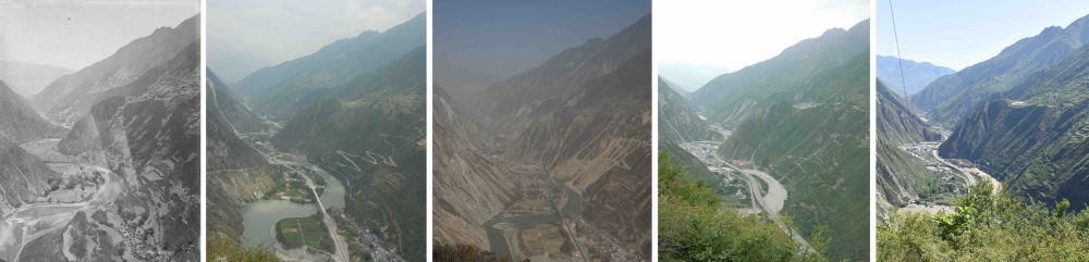拼版照片:1908年5月27日威爾遜拍攝的岷江河谷(左一,印開(kāi)蒲供圖)和2007年8月26日、2009年3月14日、2014年6月22日、2019年6月5日由印開(kāi)蒲拍攝的岷江河谷照片(左二至左五)。新華社發(fā)