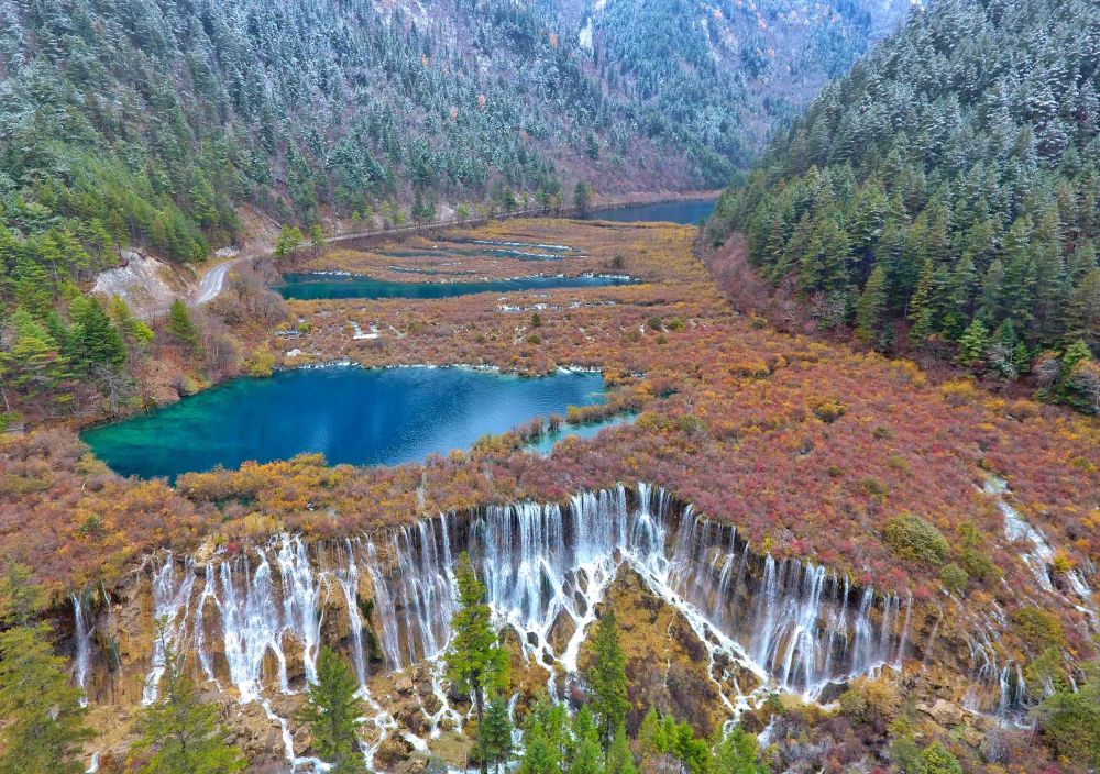 四川九寨溝景區(qū)諾日朗瀑布及諾日朗群海(2018年11月6日攝,無(wú)人機(jī)照片)。新華社記者 劉坤 攝