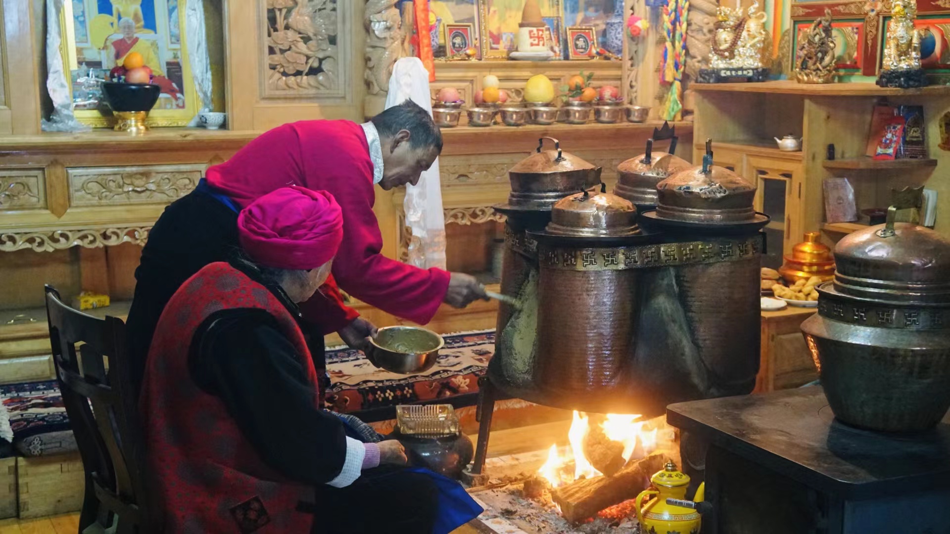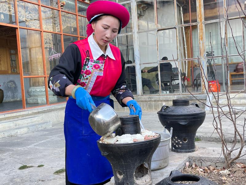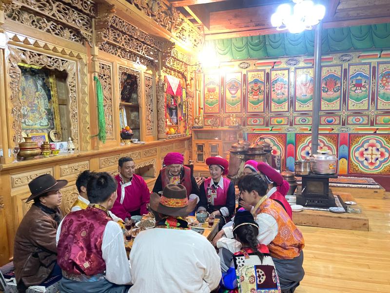 傍晚時(shí)分,“年夜飯”準(zhǔn)備完成,初稱(chēng)站在火塘邊把剛和好的稀泥一層一層地刷到火塘上,“這是藏歷新年的添新土儀式(藏歷新年接福習(xí)俗),表示我們對(duì)來(lái)年日子風(fēng)調(diào)雨順、紅紅火火的美好期待?!背醴Q(chēng)把這些傳統(tǒng)習(xí)俗認(rèn)真地教給家里的孩子們。