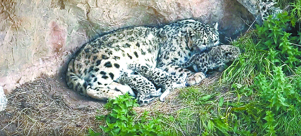 雪豹愜意地哺育幼崽。 祁連山國家公園青海省管理局供圖