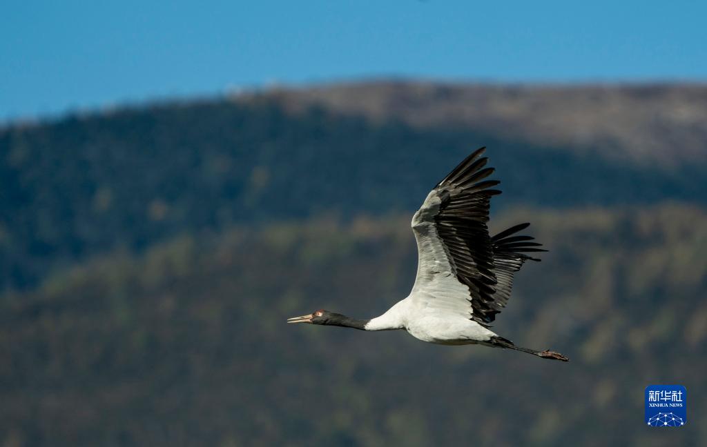 2月21日,黑頸鶴在納帕海展翅起飛。中新社記者 劉冉陽 攝