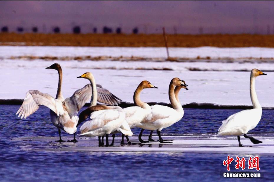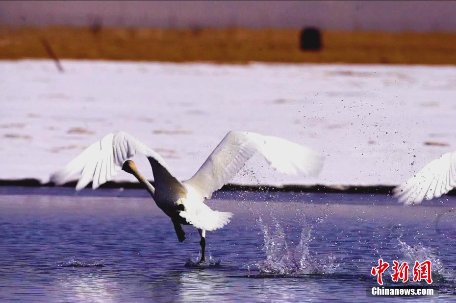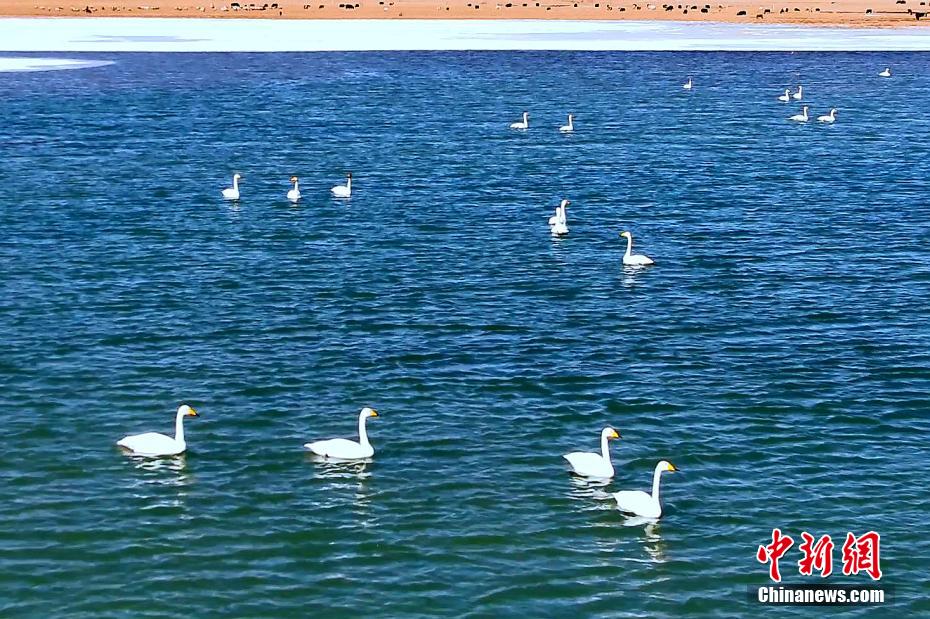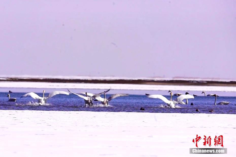 高原初春,在素有“高原藍(lán)寶石”之稱的青海湖,記者拍攝到成群大天鵝在湖面上練習(xí)起飛、降落、滑行。青海國家公園觀鳥協(xié)會會長王艦艇介紹,每年3月中旬,在青海越冬的大天鵝都會踏上北遷繁殖路。目前在青海湖的大天鵝多為青海東部黃河流域的“冬候鳥”,在青海湖短暫停留后北遷到夏季繁殖地,在秋末初冬時又會“舉家”回歸來到越冬地。大天鵝屬雁形目鴨科天鵝屬,為國家二級重點(diǎn)保護(hù)野生動物,在國內(nèi)主要繁殖于新疆巴音布魯克,主要越冬地有天津及河北沿海、山東榮成和東營、黃河中下游濕地、甘肅、青海、新疆等地。青海湖作為大天鵝的主要越冬地之一,開闊的湖面、涌流的泉水與充足的食物為大天鵝提供了適宜的棲息環(huán)境。