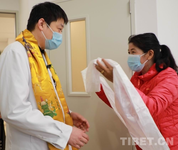 圖為來自青海省果洛藏族自治州的唇腭裂患兒家屬為中國醫(yī)學科學院整形外科醫(yī)院唇腭裂整形科主任宋濤獻上哈達 攝影:劉莉