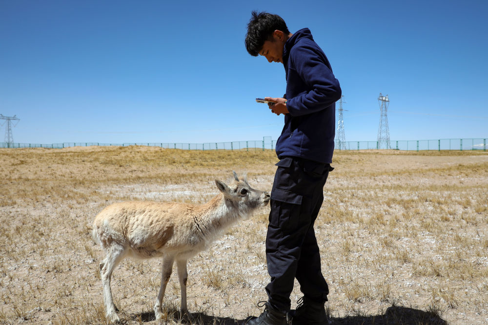 4月15日,巡山隊員才文多杰在拍攝小藏羚羊生長情況影像。新華社記者黃豁 攝