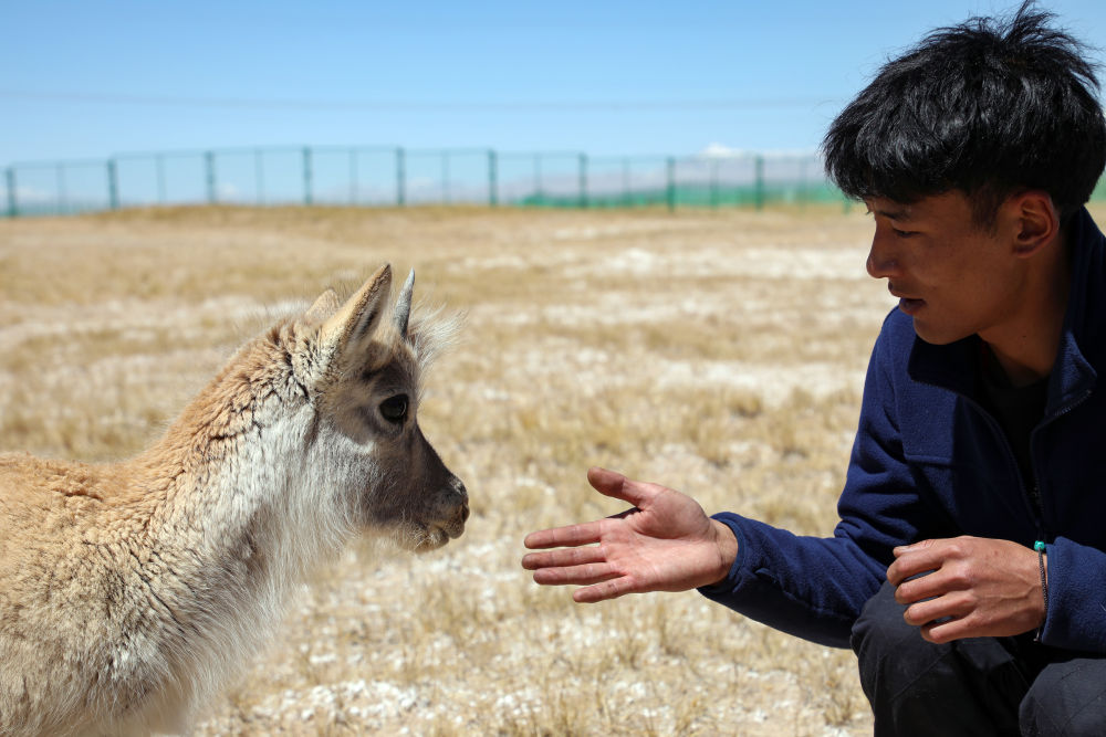 4月15日,獲救小藏羚羊與照顧它的巡山隊員才文多杰。新華社記者黃豁 攝