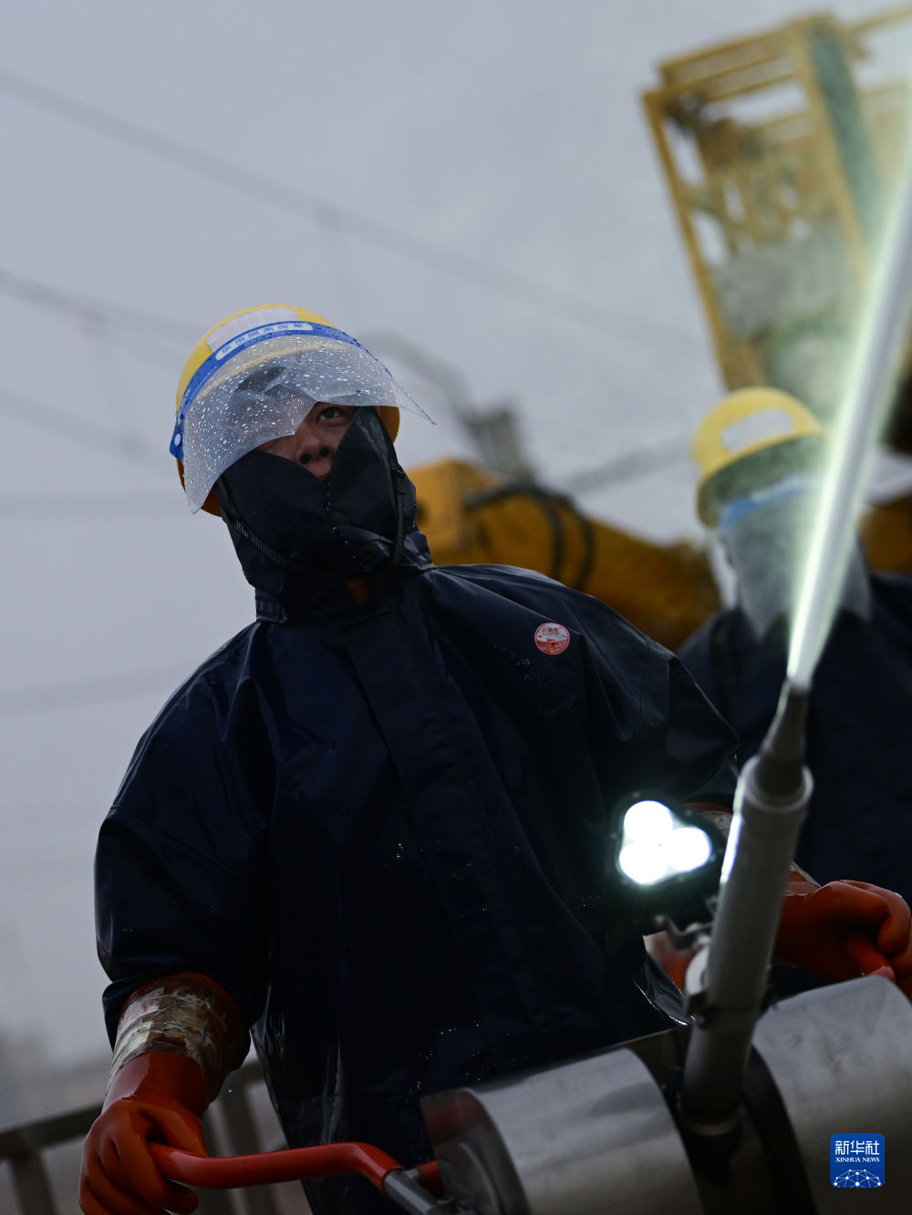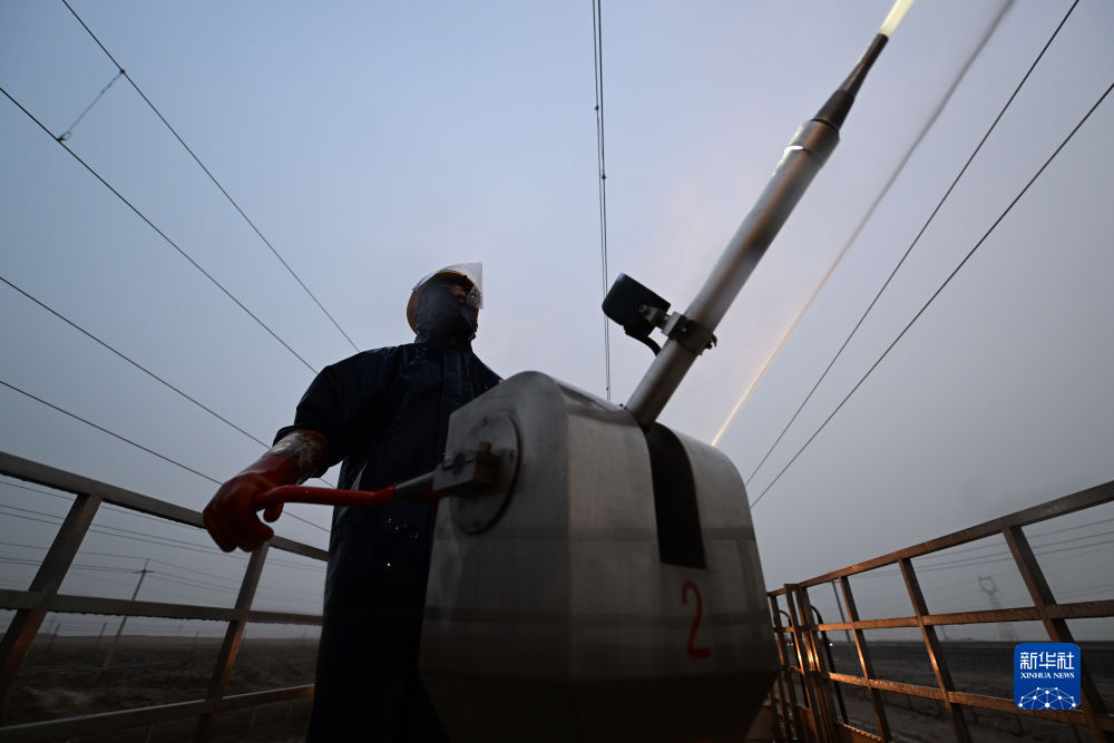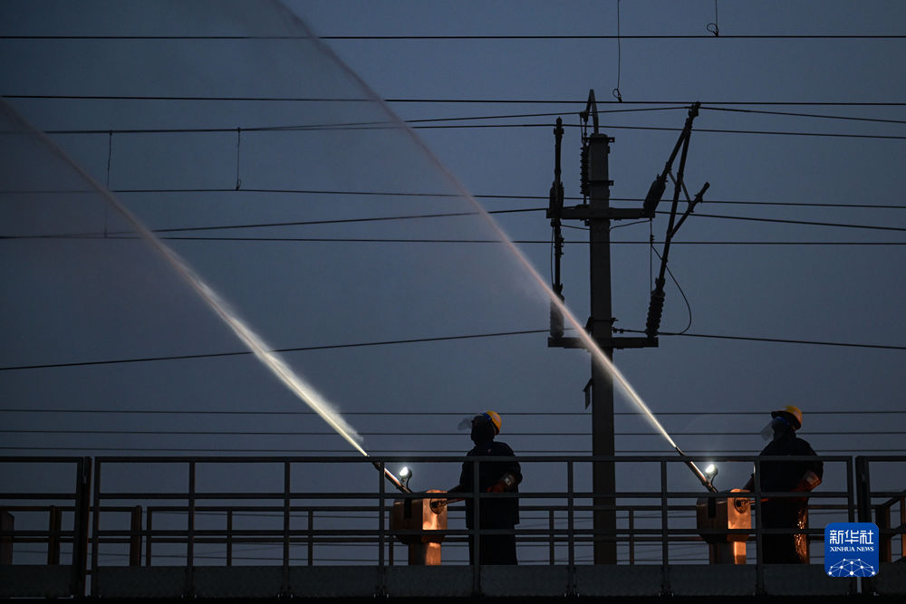 4月20日,中國鐵路青藏集團(tuán)有限公司西寧供電段格爾木大修車間大修網(wǎng)工區(qū)檢修工使用高壓沖洗水槍對(duì)絕緣子設(shè)備進(jìn)行清洗。新華社記者 張龍 攝